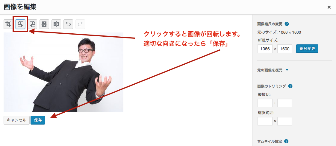 のボタンをクリックすると画像が回転します、適切な向きになったら「保存」をクリック