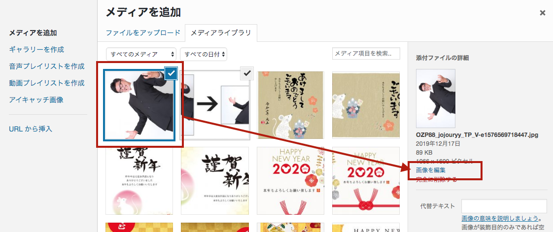 1. 「メディアを追加」より該当の写真を選択し「画像を編集」をクリックします。