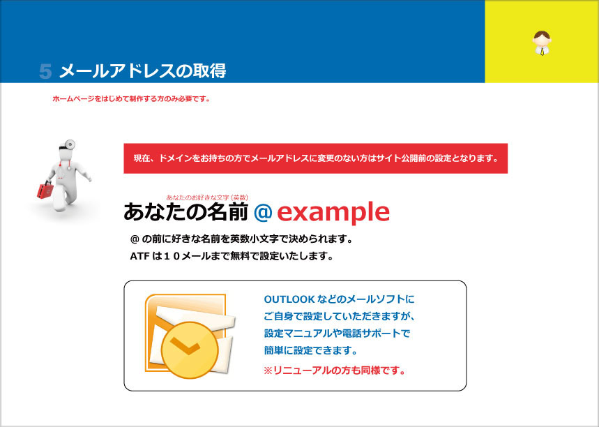 OUTLOOKなどのメールソフトに ご自身で設定して頂きますが、 設定マニュアルや電話サポートで 簡単に設定できます。 ※リニューアルの方も同様です。