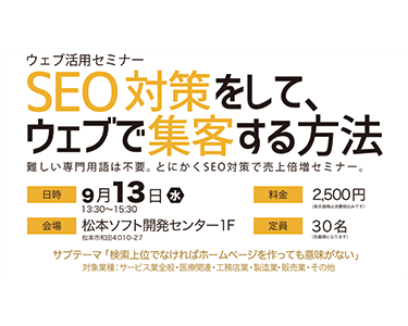 SEO対策をしてWebで集客をする方法セミナーとは? 2017年9月13日(水)13:30〜15:30 松本市ソフト開発センター1Fで、SEO対策をしてWebで集客をする方法セミナーを開催いたします。 このセミナーに参加