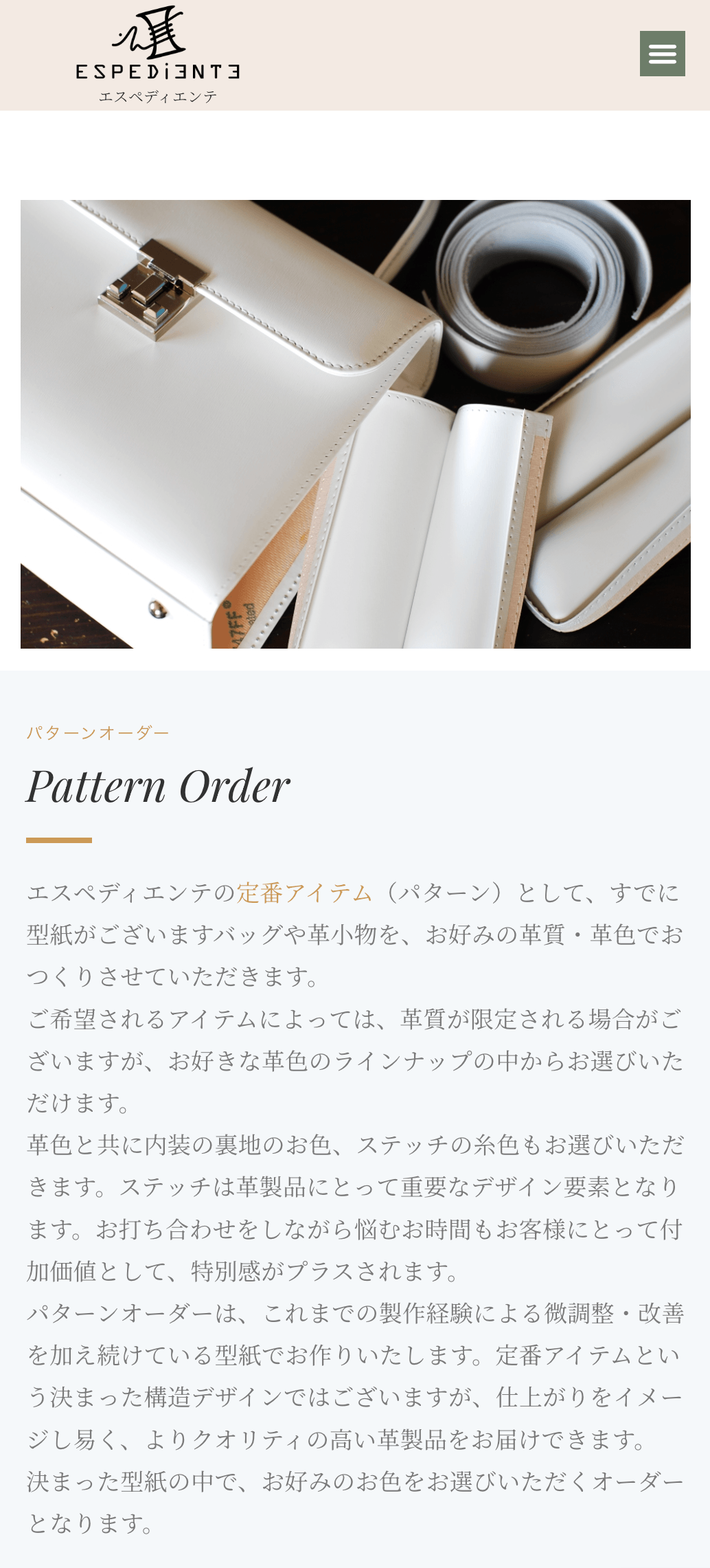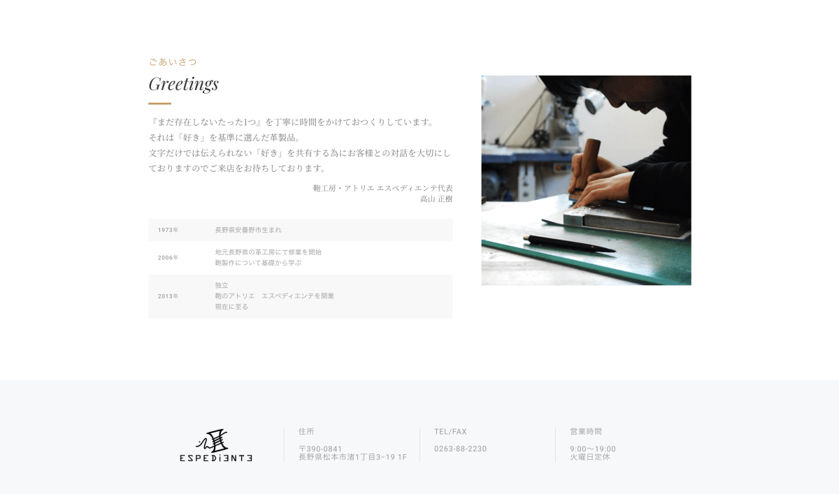 松本市に工房を構える革工房・アトリエエスペディエンテ様のホームページリニューアルをしました。職人の手仕事が生み出す鞄、革小物の魅力を最大限に引き出すため、高品質な画像を多用し、製品のディテールを丁寧に紹介しています。また、ブランドのコンセプトや職人の想いを伝えるコンテンツを充実させ、ユーザーが製品への愛着を感じられるようなデザインを心がけました。