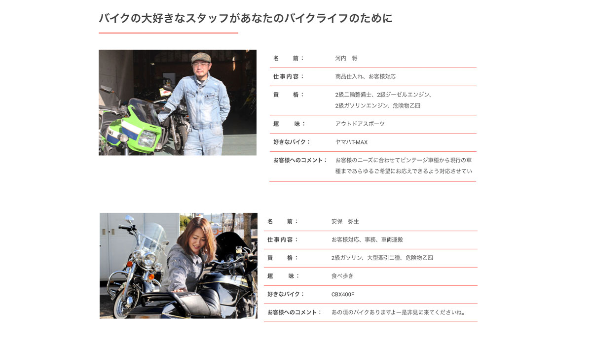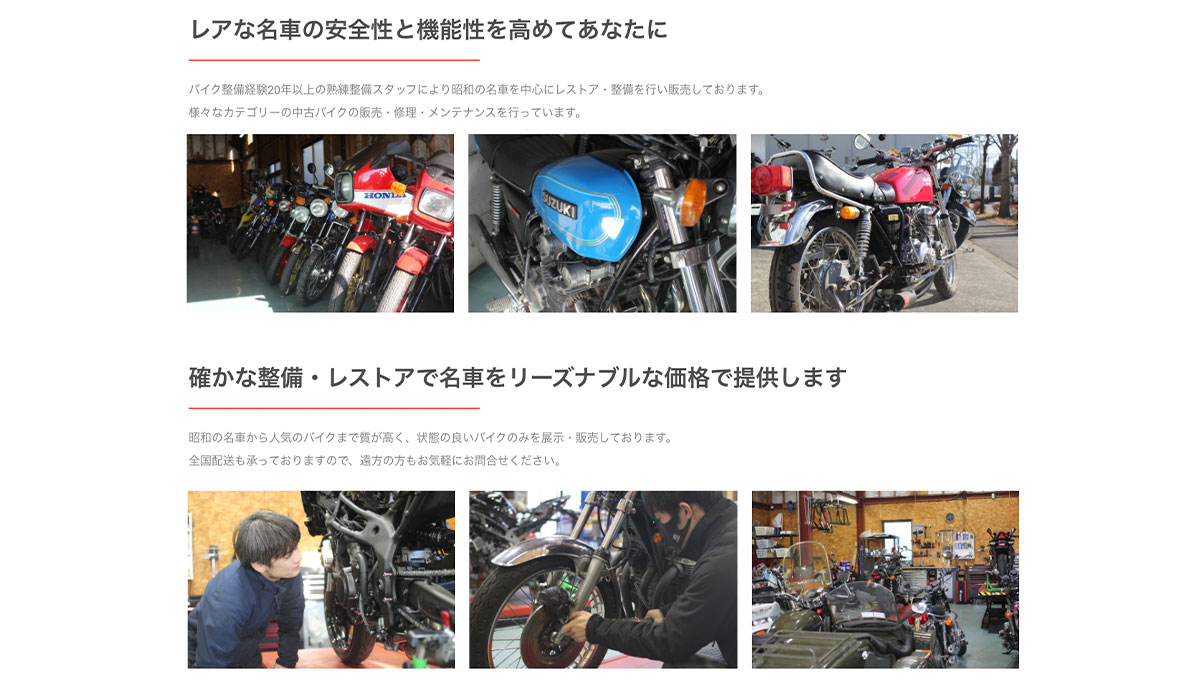 新車から昭和の名車まで、幅広くオートバイを取り扱っていますので、きっとお気に入りの一台を見つけられるバイク販売、修理専門店です。整備士として豊富な経験を持つスタッフがお客様一人ひとりに心を込めて対応しています。バイク好きが集まる店舗の雰囲気とスタッフの人柄が見えるサイト制作を心がけました。