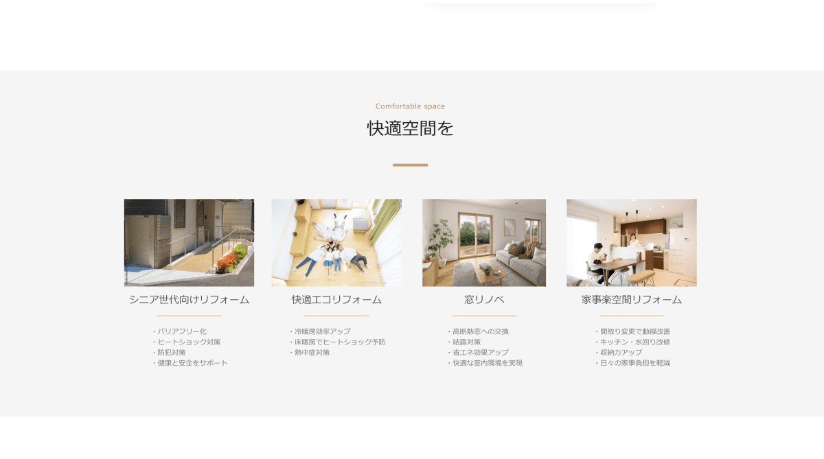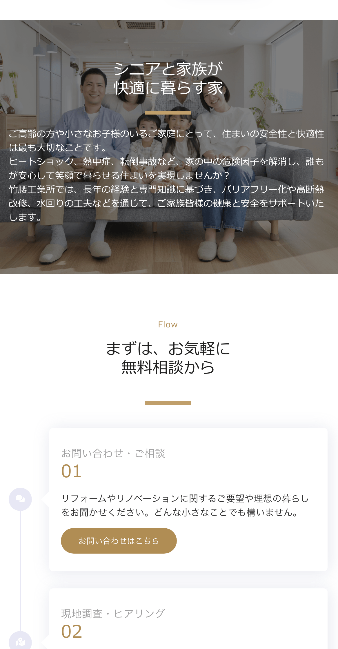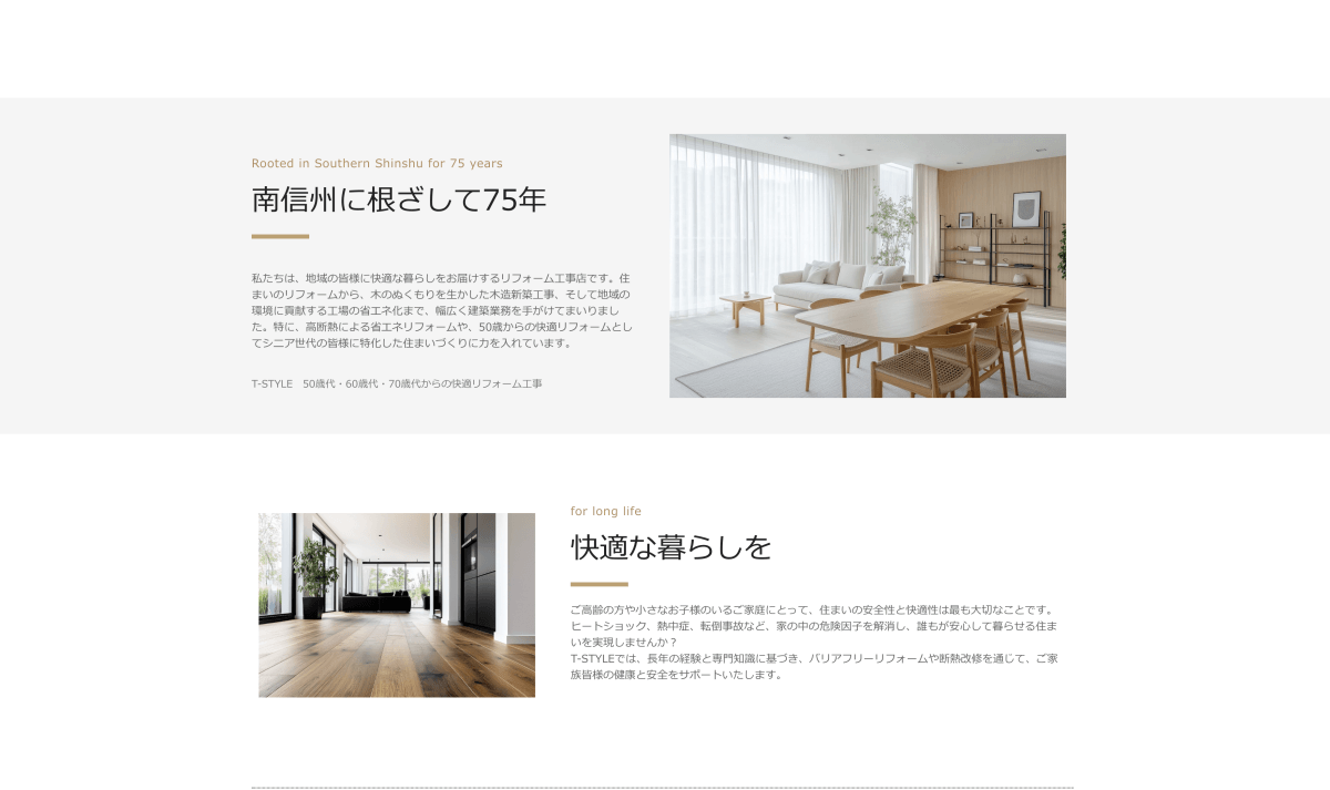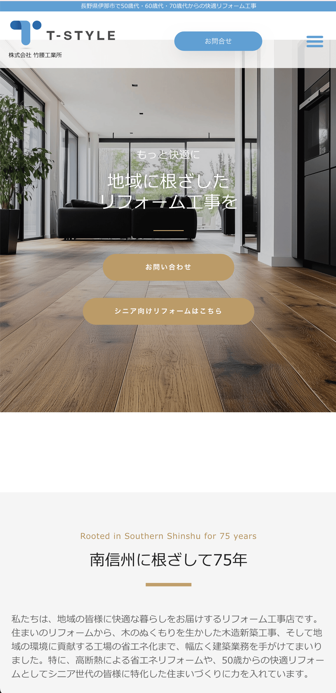 伊那市を中心に活動する建築会社様のリフォーム専門サイトを制作しました。。シニア向けリフォーム、水回り、リビング、外壁など、多岐にわたるリフォームの種類を分かりやすく分類し、それぞれのニーズに合わせた情報提供を行っています。お客様の理想を形にするための丁寧なヒアリングから施工までの流れも明確に示し、安心して相談できる環境を整えました。