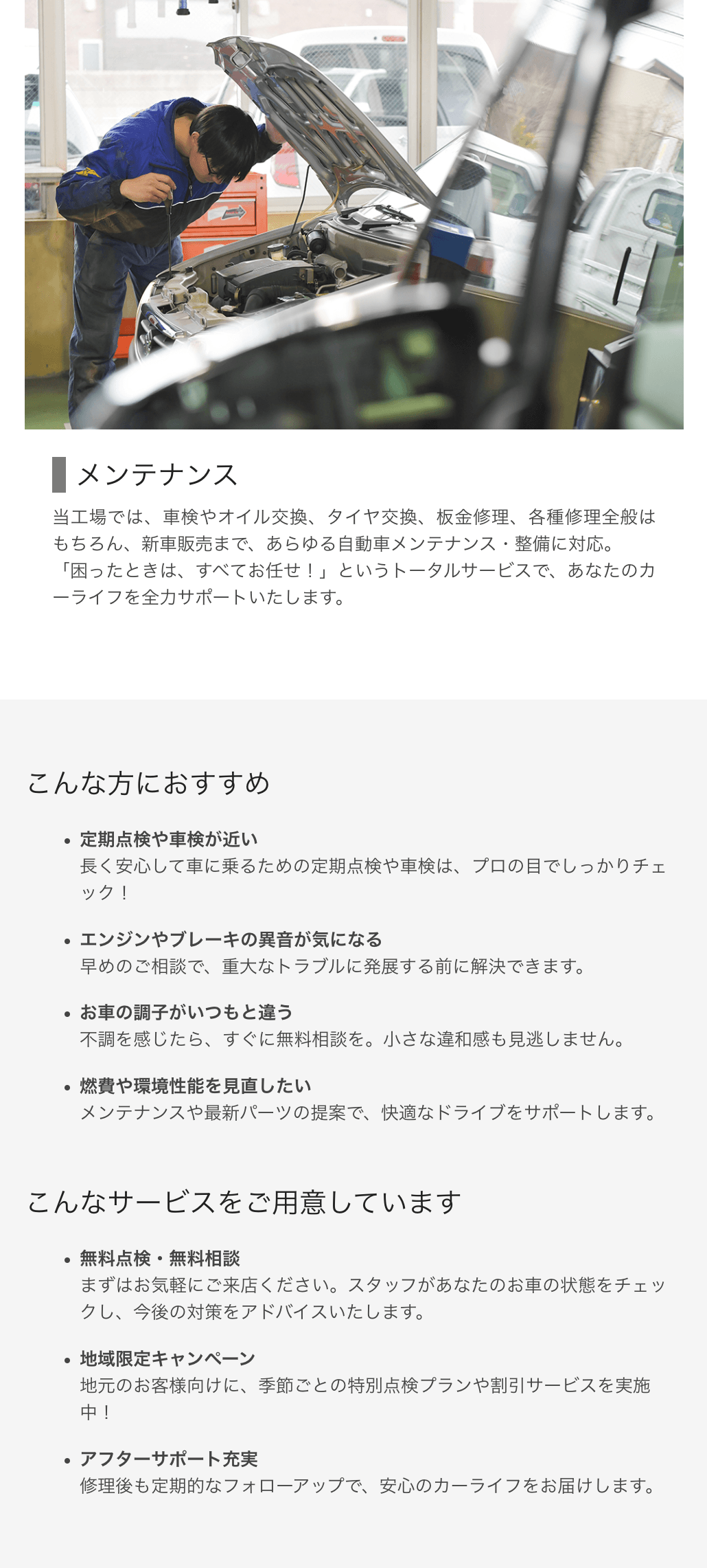 松本市で自動車の整備、修理、販売を手掛ける企業様のホームページリニューアルを実施しました。お客様が安心してサービスを利用できるよう、提供するサービス内容(車検、点検、修理、新車・中古車販売など)を分かりやすく整理し、信頼感を伝えるデザインを心がけました。実績豊富な整備士の紹介や、最新の設備情報を掲載することで、技術力の高さをアピールしています。お客様が求める情報にスムーズにアクセスできるよう、サービスごとの詳細ページも充実させています。